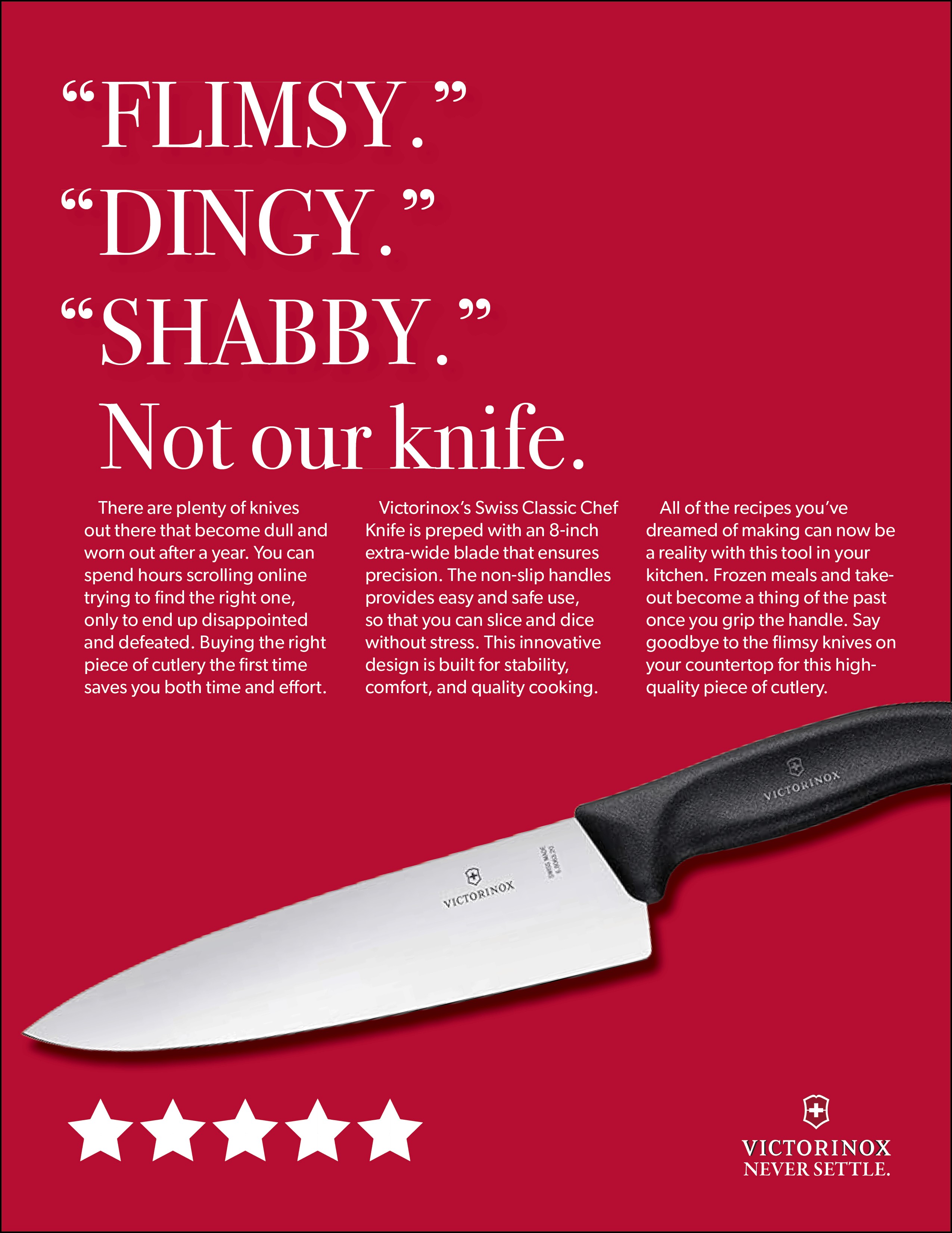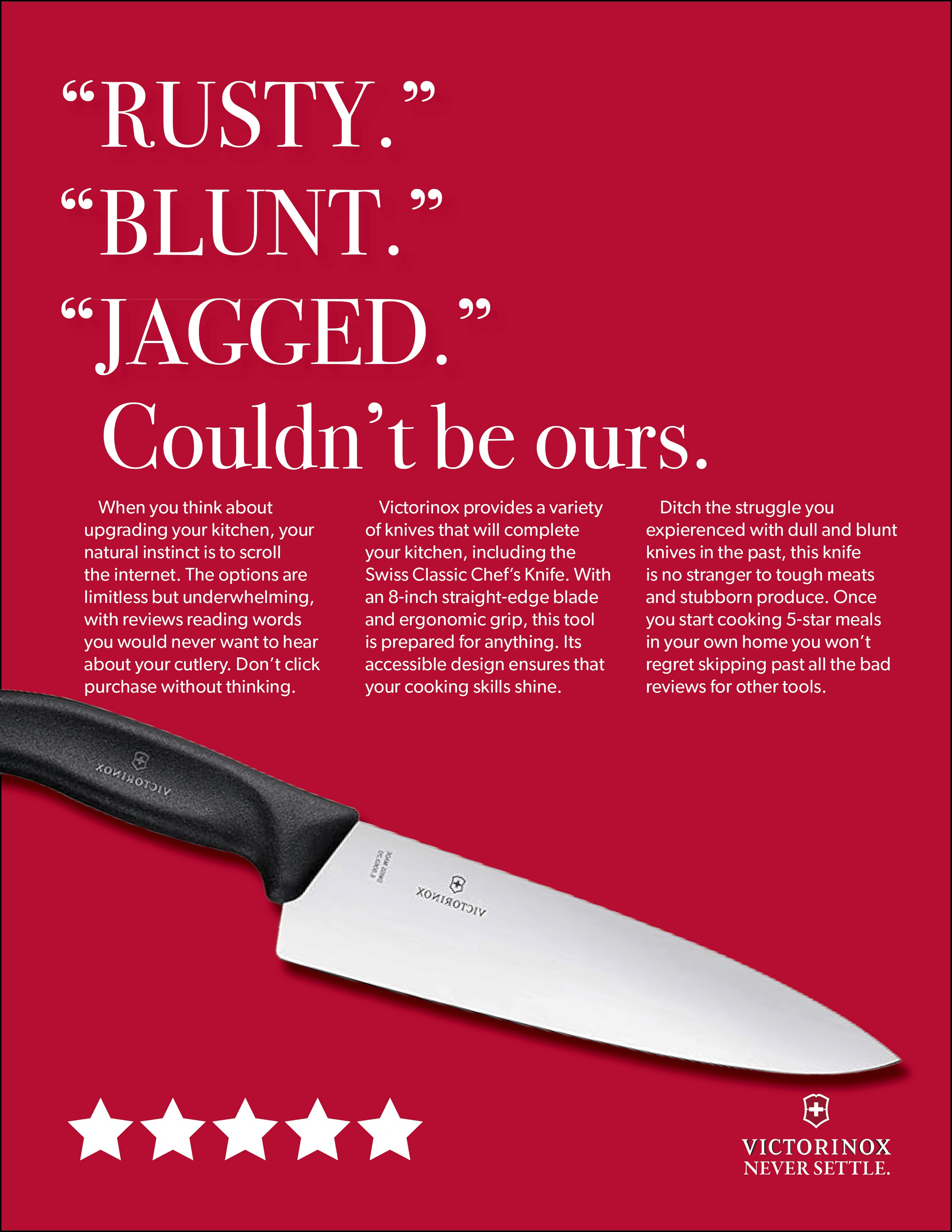 Our Objectives was to position Victorinox knives as the leading brand of entry-level kitchen knives for young adults. As a lot of knives are basic and have no heritage we wanted people to "never settle" on a knife that isn't made with "Swiss precision."
