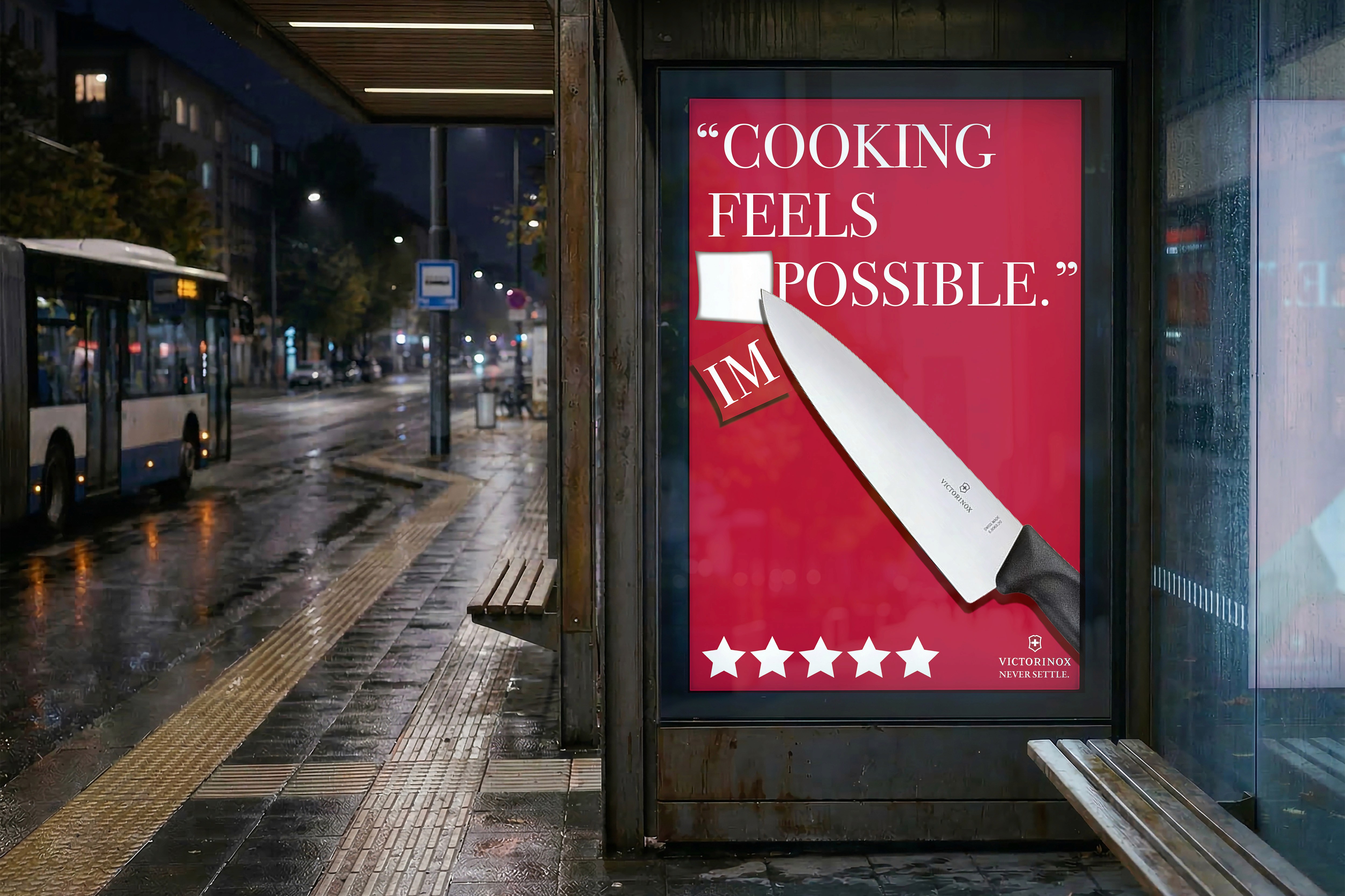Catching commuters right before they head home to their kitchens, this transit shelter ad uses the physical environment to stop traffic. It acknowledges the end-of-day exhaustion where cooking feels impossible, and visually slices through that doubt to offer a 5-star solution.